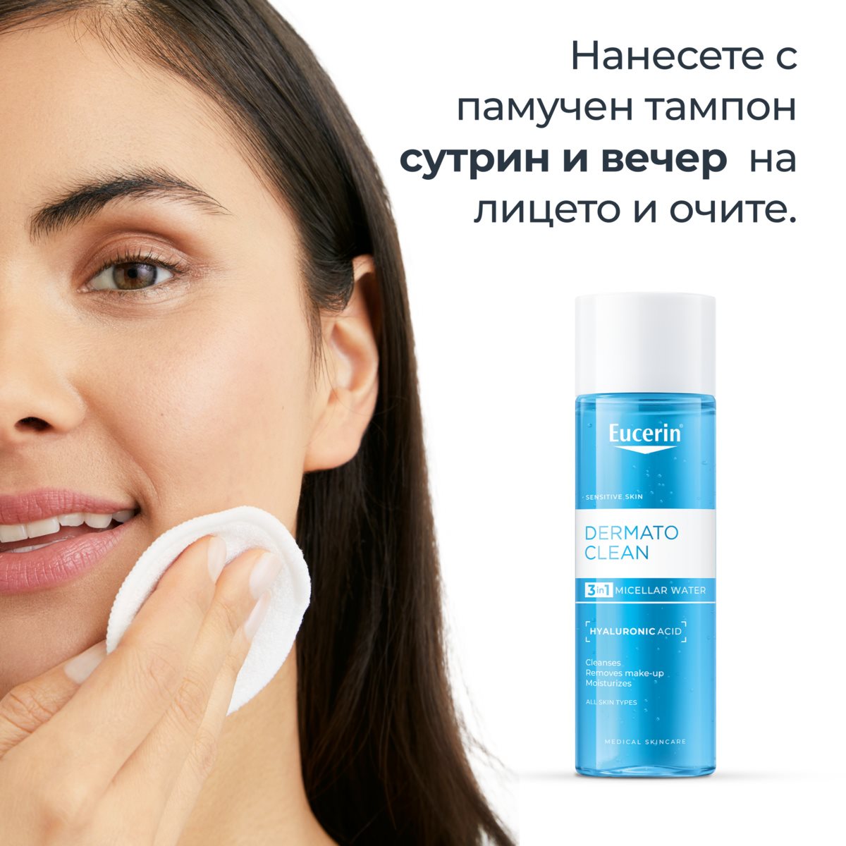 Eucerin® DermatoClean Мицеларна вода 3 в 1 е нежен и ефективен почистващ продукт за лице, който дерматологично и в дълбочина, но щадящо почиства и отстранява замърсяванията и грима от лицето и очите. Формулата с хиалуронова киселина и други хидратиращи съставки не изсушава кожата. Без аромат.