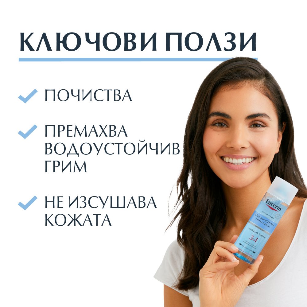 Eucerin DermatoCLEAN Мицеларна вода 3в1 с хиалурон премахва водоразтворимия грим.