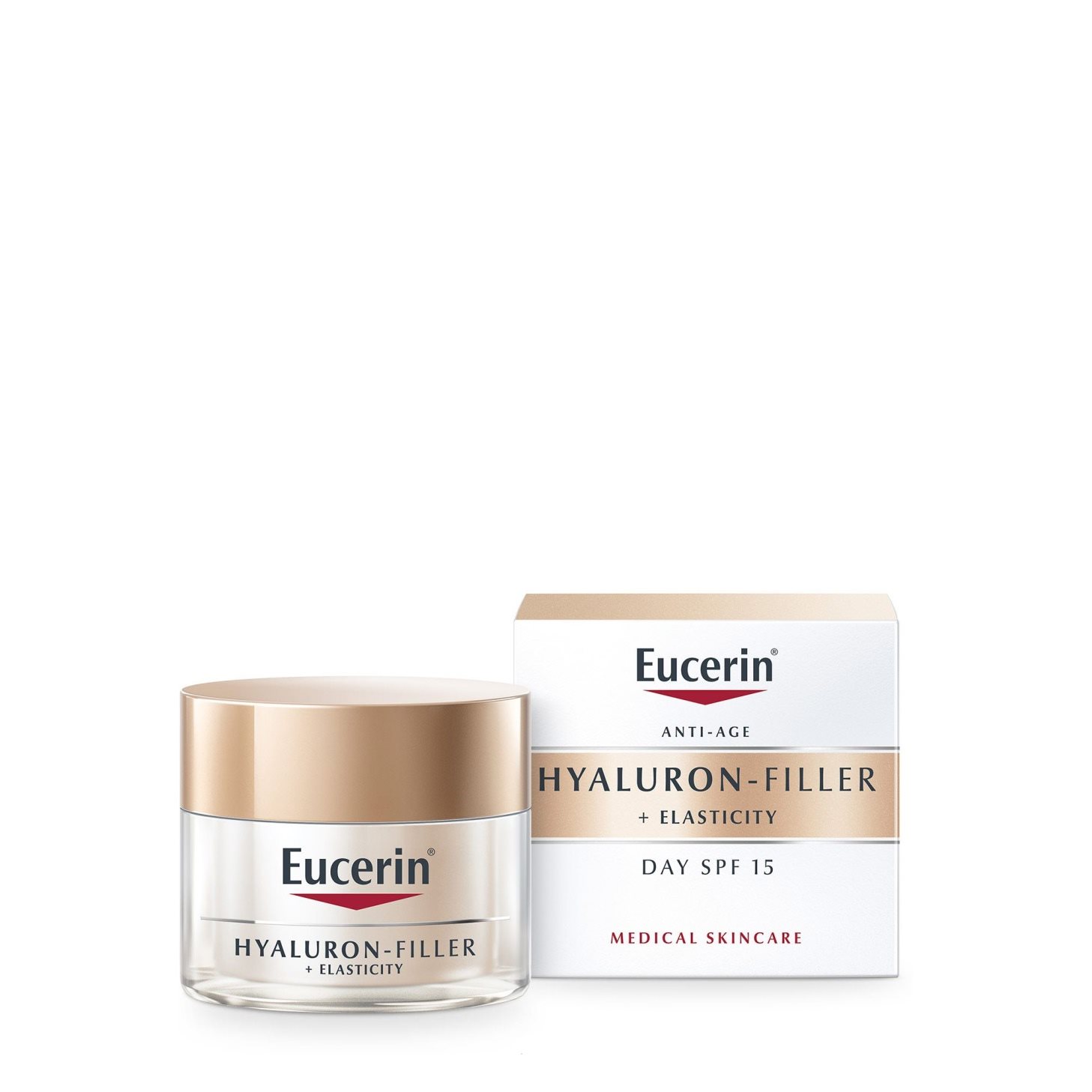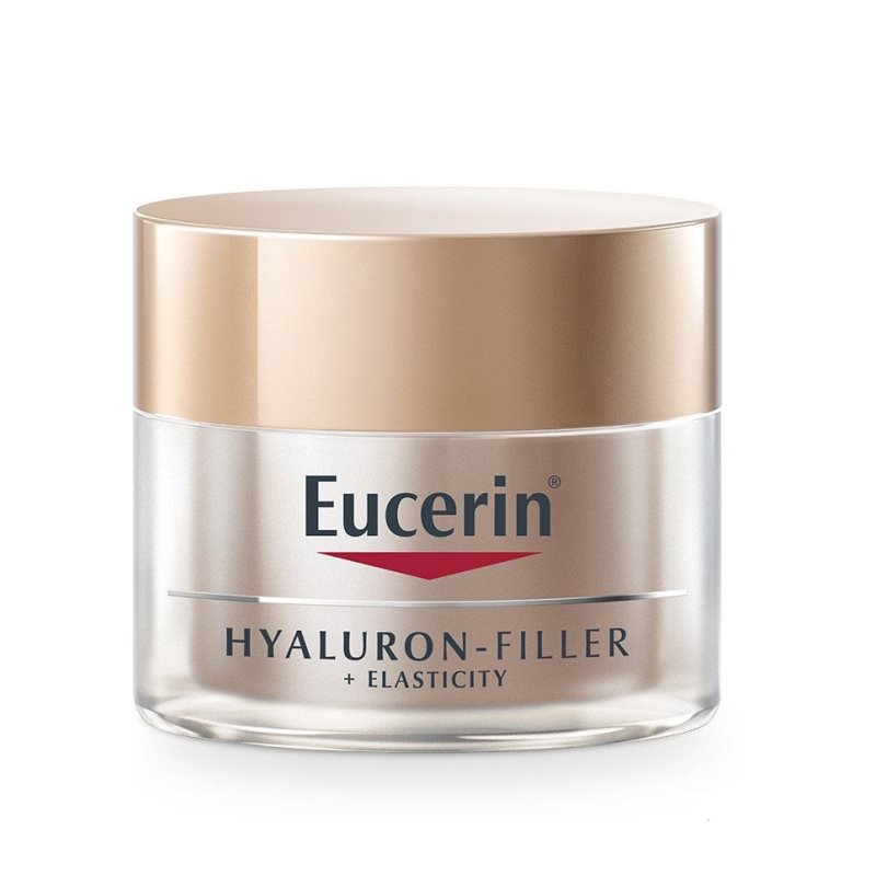 Активните съставки в Eucerin Hyaluron-Filler + Elasticity Дневен крем с SPF15 и Eucerin Hyaluron-Filler + Elasticity Нощен крем действат заедно, така че да подобрят различни признаци на стареене. Формулата съдържа иновативната комбинация на Eucerin от хиалуронова киселина с високо и ниско молекулярно тегло за по-целенасочен подход, който видимо запълва дори дълбоките бръчки. Хиалуроновата киселина с високо молекулярно тегло действа така, че да подобри хидратацията в най-външния слой на епидермиса (където се образуват фините линии и бръчки), докато хиалуроновата киселина с ниско молекулярно тегло, чиито частици са 40 пъти по-малки1, прониква по-дълбоко в епидермалните слоеве, за да стимулира собственото производство на хиалуронова киселина на кожата там, където се образуват по-дълбоките бръчки.
