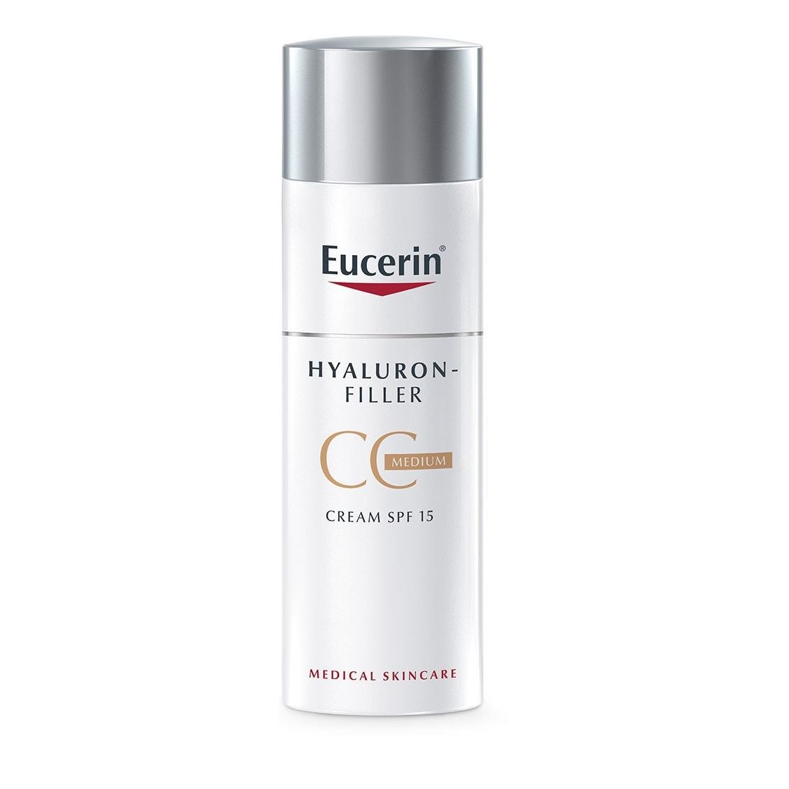 Формулата на Eucerin Hyaluron-Filler CC крем Medium с SPF15 съдържа хиалуронова киселина с високо и ниско молекулярно тегло и глицин-сапонин, за да запълни фините линии и дълбоките бръчки за по-млада на вид кожа. Той съдържа също цветни пигменти, за да осигури равномерен и сияен тен.