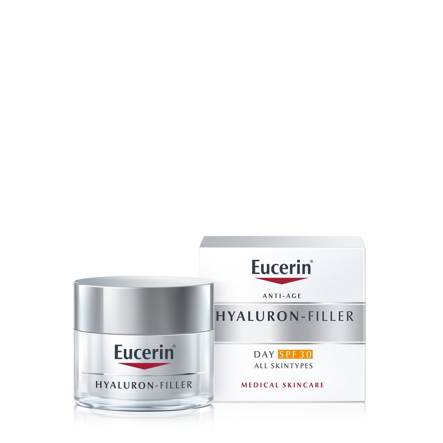 Eucerin Hyaluron-Filler Дневен крем с SPF30 за всеки тип кожа разполага с уникална комбинация от хиалуронова киселина с високо и ниско молекулярно тегло, която изглажда фините линии и запълва дори най-дълбоките бръчки за подмладен външен вид.
