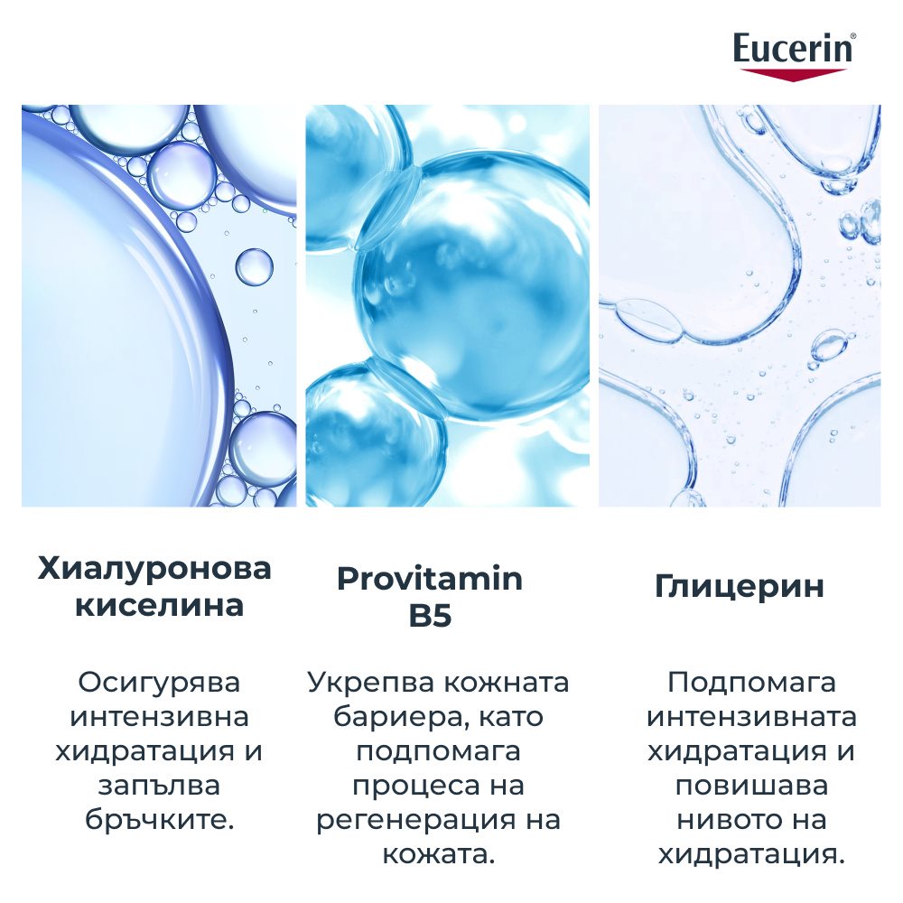 Дехидратацията и стареенето забавят обновяването на кожата, което прави бръчките и фините линии по-дълбоки. Eucerin Hyaluron-Filler +3x Effect Стягащ серум изпъва бръчките благодарение на микрохиалуроновата киселина, която задържа влагата в кожата, намалявайки появата им. Ектоин подпомага допълнително еластичността на кожата, осигурявайки дълготрайна гладкост.