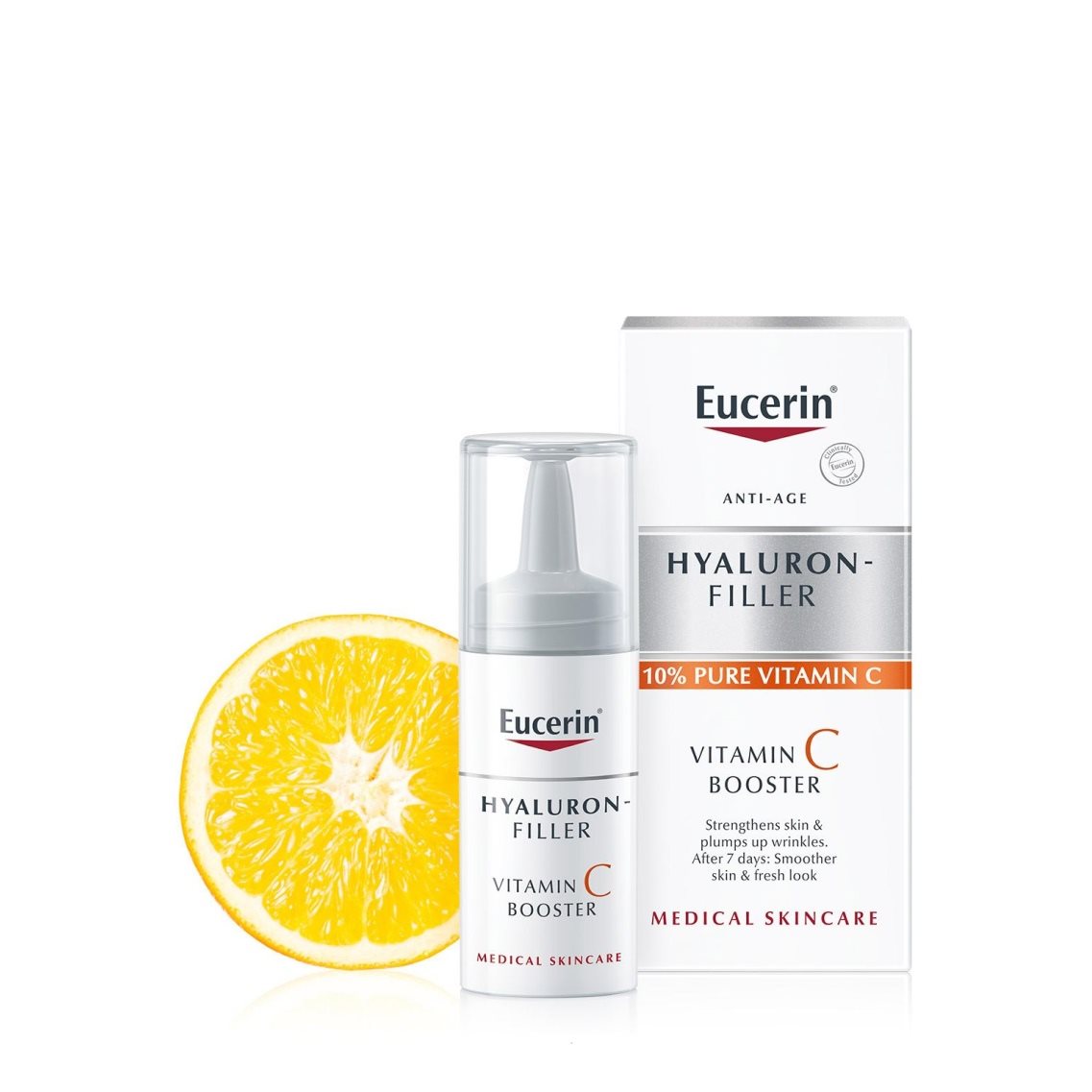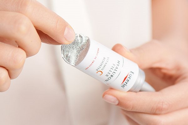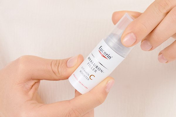 Eucerin Hyaluron-Filler Vitamin C Booster използва антиоксидантното и стимулиращо производството на колаген действие на 10% чист и активен Vitamin C. Той също съдържа хиалуронова киселина с ниско молекулярно тегло и доказано в клинични и дерматологични проучвания подсилва кожата, запълва бръчките и придава по-гладък, свеж и сияен вид на кожата след само седем дни, като резултатите се подобряват с течение на времето. Може да се използва самостоятелно за справяне с първите признаци на стареене, макар че препоръчваме използването му в комбинация с дневни кремове от серията Eucerin Hyaluron-Filler, като например: Eucerin Hyaluron-Filler Дневен крем със SPF 15, Eucerin Hyaluron-Filler Дневен крем със SPF 30, Eucerin Hyaluron-Filler CC Крем със SPF 15 Light или Eucerin Hyaluron-Filler CC Крем със SPF 15 Medium.